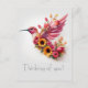 En flygande hummerfågel av rosa solblommor, alleys och tulpaner Front: "Thinking of you!" hälsning som du kan göra själv.
