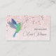 Det här dammiga affärskortet med rosa glansig har en söt grönt hummingbird med blommar av andlig rosa körsbär på ro-guld glitter. Elegant professionell affärskort för konstnärer, skönhet, salon, dula, baby