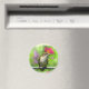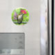 Den här magneten har en ung ruby-throated hummingbird som ännu inte har utvecklat ruby-färgningen på halsen. Han är sitta vid metall pub, redo att dyka in i nektar från blommorna som omger honom. Bakgrunden är en mjuk, underbar palett av rosa, rött, guld, gult och grönt.