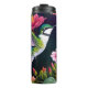 Tumlare har en grönt, blå, mauve och vit hummingbird omgiven av en mängd färgstarka blommor. Denna livliga, multifärgad fågelkonst är ljus och glad, trots mörkens bakgrund! Underbart vår eller sommartema för blommigt av fågel älskare och fågelskådare.