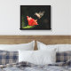 En hovande hummingbird når nektar till en pulserande röd hibiscus-blomma.