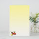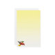 Den här stationen har en ruby-throated hummingbird. Hon bor i luft medan hon dricker nektar från den gyllene mittpunkten av en ljusröd zinkblomma. En blommar av zink-gult ligger nära och några gröntar lämnar färdigt sammansättningen. Färg verkar luta mot gultens övertoningsbakgrund.