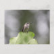 En hummingbird-perches på kant i en stor grönt löv, med en mjuk bakgrund av suddig grej. Dess potikabak och mjöliga färg skapar en känsla av ömtålig skönhet.