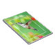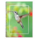 En knölfågel fotograferad mitt i luft med blommor med mjukt fokus som bakgrund.