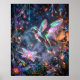 A radiant hummingbird hovers inside a futuristic voltage garden, crafted from metallic feathers, glowing circuitry, and luminous wing trails frozen in motion. Pink, cyan, emerald, violet, and gold tones shimmer across its tiny aerodynamic form. Neon flowers, electric vines, floating pollen lights, reflective leaves, soft mist, and distant skyline silhouettes create a magical high-tech sanctuary. This elegant bird design combines speed, beauty, and modern fantasy, making it perfect for bedrooms, studios, offices, and gifts for hummingbird lovers.