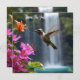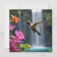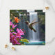 Bild av övertäckningen framför ett vattenfall är en hummelfågel på dess sätt att suga upp lite nät från blommor i närheten.