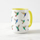 Unik mugg för hummingbird älskare med flera arter av tropiska hummingfåglar, t.ex. Fiery-throated Hummingbird, Golden-tailed Sapphire och Sapphire-bellied Hummingbird, Violetear, Coronet och Glittering Starfrontlet Hummingbird. Bilder som hämtats från ursprungliga vattenfärgsmålningar av Christiane Dobbins.