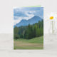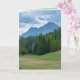Ett födelsedagskort med ett foto taget på en golfbana. Vyn är av en golfgrön med täta gröna träd inte alltför långt borta; ett berg i bakgrunden och en molnig himmel. Ett riktigt naturfoto för utomhusmiljön.