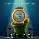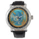 This image is a circular watch with a black rim and white numbers. The watch face features a whimsical illustration of a blue narwhal with a golden tusk, wearing snorkeling goggles and reading a newspaper titled "NARWHAL TIMES" while sitting on a toilet underwater. The underwater scene includes blue tiled walls, seaweed, starfish, and a seahorse, with bubbles floating around the narwhal, all contained within a golden inner frame.