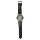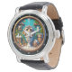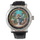 Den här bilden är en cirkelformad WATCH med en svart fälg och vita siffror, med en vismisk illustration av en chockad tittar orange pufferfisk som bär snorkelglasögon och läser en tidning. medan sitta på en toalett. Scenen är under vatten med blå väggar, sjögräs, svält och sjöar. Bubblorna flyter runt den krångliga karaktären, alla inneslutna i ett gyllene inre ram.