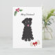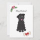 Pudel i Svarta leksak i mitten med utsidan av tunga och ett anpassade hälsning över på fast vit bakgrund. Vattenfärgad holly och bär överst och ben med rött band vid grund. Ytterligare text att anpassa på baksidan. (Leksak pudel och bengrafik kredit till Lori@SaltTownStudios)
