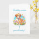 1:a födelsedagskortet för ett barn som kärlek sin marionett hund. En söt marionett som ler för att säga lycklig 1:a födelsedag. En brun marionett med blommor och fjärilar som skickar födelsedagspresent önskemål.