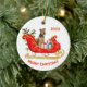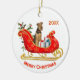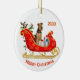 En vacker Airedale Terrier-Hund sitter bland paket i en ornatrött och guld julsleigh. Längst upp finns en fält som kan anpassas efter ditt namn eller det aktuella året. Vid grund finns en annan anpassningsbar som heter fält som säger "God jul". Båda sidor av dekorationen har samma bild.