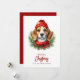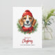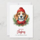 Söt vattenfärg stil illustration av en vacker Beagle-hund som bär en röd scarf och hatt mot bakgrund av julkras greenery.
