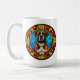 Glasbild av konstnärlig nedfläckad av en hund med färgstarkt geometriskt mönster och ornatdetaljer. Markerar en blandning av klassisk design med moderna uttryck.