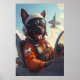 Ta av dig den här kraftfulla Fransken Bulldog, som passar in i en rödtrimmad Luft Force-flyguniform. Hans hjälm avspeglar en ljus blå himmel och hans namn-plåster lyder stolt "WOOF-ONE". Han var tryggt förtjust i sin cockpit, han har stunder från livstid medan en annan jet bakom honom lämnar ett moln av cartoonistisk rök. Med utlandet tunga och hela ögon är denna valp redot för handling. Perfekt för militärområden, flygplansentusiaster eller någon som kärlek modiga lilla hundar.