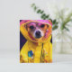 Hund i ett vykort för regnrock för gult