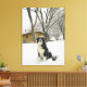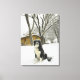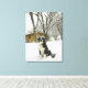 Hund i snö med lodringshytten bakom sitta canvastryck
