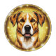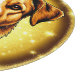 En levande illustration av en hund ansikte, försedd med en strålande gyllene bakgrund och vackra gnistor, som förmedlar värme, elegans och glädje. Perfekt för teman firande, kärlek och komplementaritet.