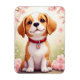 Den här lysande illustrationen har en oemotståndligt söt marionett med sinande, mousserande ögon och ett milt leende. Valpen, med sitt mjuka bruna och vita päls, bär ett ljust rött halsband med namn bricka och tillför en aning personlighet och värme. Sätet i en serenträdgård av ömtåliga blommar av körsbär med rosa, marionen ser söt ut framåt och framkallar en känsla av fred och glädje. Den mjuka, pastellbakgrunden och den milda belysningen skapar en drömmande, storyboksliknande atmosfär, perfekt för att åberopa känslor av stolthet under våren och varsam kärlek. Denna hjärtslitande scen är idealisk för barnens illustrationer i bok, gratulationskort eller till och med klädesformgivning som syftar till att sprida lycka och charm.