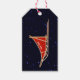 En hund med en rödslad påse som läggs ovanpå en stjärnbakgrundsbild. Du kan anpassa märkrn genom att lägga till lite text på slingpåsen, och du kan lägga till ytterligare text på baksidan.