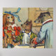 Antik illustration - Hundar som är ordentligt klädda för middag - Denna söta vintagebild på en glad hund som njuter av sin måltid är en underbar present till hundälskare. Tiken bär en vacker lång, färgrik viktoriansk klänning och en hundhatt. Den vackra hunden har en ljusblå rosett på sin hatt och bär stora röda rosetter på sin klänning, bara för att den lilla hunden ska känna sig kvinnlig och hon är en så söt hund! Tiken har långa öron, medan hennes manliga följeslagare har korta öron. Han hunden njuter av en måltid hundstek, sittande ordentligt vid det viktorianska hundbordet, äter med händerna och med silverbestick, som en riktig viktoriansk hund. Titta - han berättar för tiken hur underbar hans kaffe är! Denna hund bär en vacker grön jacka och har stoppat in sin servett vid kragen för att inte spilla på sin vackra hunddräkt. Han hunden tittar kärleksfullt upp på sin kvinnliga servitris, som om han sa: "Tack för den underbara hundmåltiden. Du är en underbar kock!" Vad en rolig illustration. Viktorianerna älskade att ge sina djur människoeg