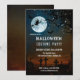 En magisk inbjudan från Halloween fest med en pooky-kyrkogård i fullt måne med en häxfluga på en bom, fladdermöss. Ett träd med mousserande ljus tillför en festlig beröring.