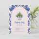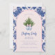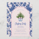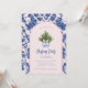 Denna inbjudan till julfesten har en liten årtusendesformgivning med ett Julgran i en blå och vit kinesisk poppig vapensköld med en blå och rosa som fäste gräns runt kant. Framsidan och baksidan har ett samordnande fuktmönster.