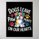 Den här rörliga grafiken visar en livlig brun och vit tecknad hund, med tungan glatt utsträckt, i en lekfull springande ställning. Ovanför och under den glada hunden förmedlas budskapet "HUNDAR LÄMNAR TÅAVTRYCK på våra HJÄRTAN" kraftfullt i fet vit och röd text, prydd med ett livligt rött hjärta och spridda färgglada tassavtryck i gult, blått och rosa. Den enfärgade svarta bakgrunden ger stark kontrast. Digital nedladdning endast för personligt bruk.