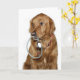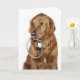 Golden retriever med stetoskop, spelar veterinär eller hindrar veterinären från att undersöka honom