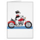 En hund rider en röd motorcykel. Hans öron, scarf och svan flyger i vinden, och hans hjälm har bendekal.