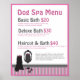 Detta är en stor affisch som listar priserna för dina mest populära hundvårdsbehandlingar. Du kan ändra allt från namnen på vårdbehandlingarna till priserna.