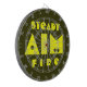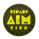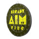 Lustigt ritbord för pub-mördare i mangrottan. Kamouflage-skuggor av ljusbrunt med ljus oliv grönt för ord. En mörkare oliv grönt bakgrund. STEADY AIM BRRE i stor text med hål i brev. Du kan byta färg på text eller bakgrund, men färg kommer att fånga öga. Från Varg Medicine