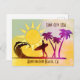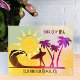 Surfan är uppe och sol är ute. En surfare med sitt yfboard går bort från handflatan träd och mot havets vågar. Ljussken strålar ner till Kaliforniens strandscen. Ord Surfa City USA ligger över konstverket och Huntington Beach, CA ligger nedanför. Färg i denna utformning är mörk brun, magenta, grönt, orange, gyllene gult och rökblå. Den färgstarka utformningen har en bokeffekt.