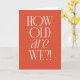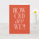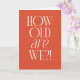 Fira att bli gammal tillsammans med en vän eller nära och kära med detta roliga och underhållande enkla födelsedagskort. Med sin stilrena text har detta födelsedagskort frasen "hur gamla är vi?!" på framsidan och födelsedagsönskningar på insidan. Detta roliga kort är bra för en bästa vän, syskon, make/maka och mer. Observera att även om Zazzle-logotypen kan tas bort, kommer Lea Delaveris Design-logotypen att skrivas ut på alla kort för att ge skapare av denna ursprungliga födelsedagskortdesign rätt kredit.