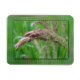Ett makroskott av en blomma med gräs sprinklad med droppar från vatten, fröna som vrider lilan mot en bakgrund av rikens grönt. Bilden är en glasmosaik av fält runt den.