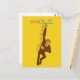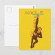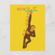 Fråga dem hur det går i rolig stil med detta vykort med en illustration av en apa som hänger från en stång tillsammans med sloganen HUR HÄNGER DET Bruna och beige färger på grafik och texten är satta mot en ljusgul bakgrund. Baksidan av detta vykort är tomt för att du ska kunna skriva ditt eget meddelande.