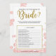Denna moderna blomster "Hur väl känner du bruden" har en rosa blomsterbakgrund med gyllene glitterstänk. Texten är skriven i en blandning av ett lekfullt kalligrafiskt teckensnitt och ett modernt sans-serif-teckensnitt, detta "Hur väl känner du bruden"-kort är personifierat med brudens namn och datum för bröllopsfesten.