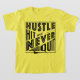 Stor djärv design för att köra och kamougie fläkt och spelare! Med ord: Hustle Slå och sluta aldrig och en bild av en slump/kamán.
