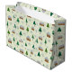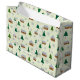 En giftpåse med en utskrift av snö som faller på hus som sprider sig mellan fem träd.