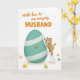 This design shows a soft digital illustration where a large teal oval with thin white horizontal bands sits in the lower left, like a decorated egg, with a bright orange heart centered on it 🌷. To the right, a small brown bear-like character stands upright on a white ladder, climbing with a careful grip and a tender, focused look that suggests it’s doing this for someone special 🐰. A tiny orange tag rests on its back, like a little note tucked in for a loved one. The background stays white and airy, letting the teal and orange stand out while keeping the scene gentle and romantic. Along the bottom, smaller patterned ovals in yellow and green scatter across the base like festive eggs laid out for a celebration. Small confetti-like dots float around the scene, adding motion without crowding the main figures. Across the top, the message “With love to my amazing HUSBAND” curves in orange lettering, with “HUSBAND” in all caps for emphasis. The ladder is bright white with evenly spaced rungs, leaning beside the teal oval as the bear-like character climbs upward.