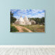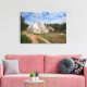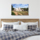 I kanvas trycks vitsten, de traditionella turillhusen formas med en borrväg och en trädgård med träd under en trevlig himlar på en semesterort nära Alberolbello i Apulien i södra Italien. Underbar dekoration på väggen!