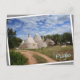 Vit-kort, konformade traditionella stadshus med en borrväg och en trädgård med träd under en trevlig himlar på en semesterort nära Alberolbello i Apulien i södra Italien med ett vitt kant och i himlar blått texten "Apulien". Bilden roteras en bit för att skapa illusionen av att den lossnar.