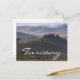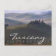 Ett vykort från ett jordbruksföretag i dimma vid gryningen i Toskana mellan det rullande backen i Val d'Orcia-dalen mellan Pienza och San Quirico d'Orcia i Italien med texten: "Toscana, San Quirico d'Orcia".