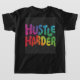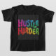 T-shirten har texten "Hustle Harder" i en lekfull bubble-brev stil med en regnbåge i färg. Konstruktionen är vibrerande och öga-fångstande, med en aning av stollig.
