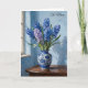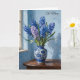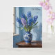En vacker bukett av blå och lavendel hyacinter sitter på ett bord vid ett soligt fönster på vacker födelsedagskort till din mamma.