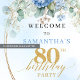 Fira 80 underbara år med denna akvarellhydrangea-välkomstskylt. Dammtorblue och guldblommor skapar en mjuk, elegant hälsning perfekt för en 80-årsfest. Boho-eukalyptusaccent och pastella färger ger tidlös skönhet åt din fest.