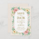 Fira ditt kommande bröllop med detta romantiska vattenstånd spara datumkortet. Med blommigtar i mjuk rosa och elfenben med eukalyptus grey som färgar stil är denna elegant perfekt för vår och sommar-bröllop. Fullständigt anpassade med dina uppgifter.