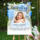 Den perfekta minnesaffischen för att hälsa familj och vänner när de kommer till firandet av ditt älskade livs firande. Speciellt för någon som älskar blommor och kanske trädgårdsskötsel - designen har ett fyrkantigt personligt foto, 5 rader med anpassad text och ett bakgrundsfoto av vackra blå hortensior. Du kan enkelt byta ut detta med ditt eget bakgrundsfoto. Klassisk men unik - den här mallen är så enkel att anpassa och kommer att bli en underbar minnessak.