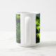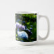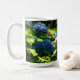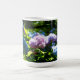 Enjoy the beauty of hydrangea flowers year round with a beautiful coffee mug featuring pink, purple, and blue hydrangea flowers in a garden.